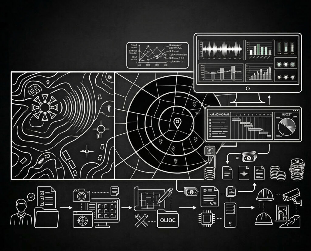 - Systemy stacjonarne – syreny alarmowe przeznaczone dla jednostek samorządowych o dużej gęstości zabudowy